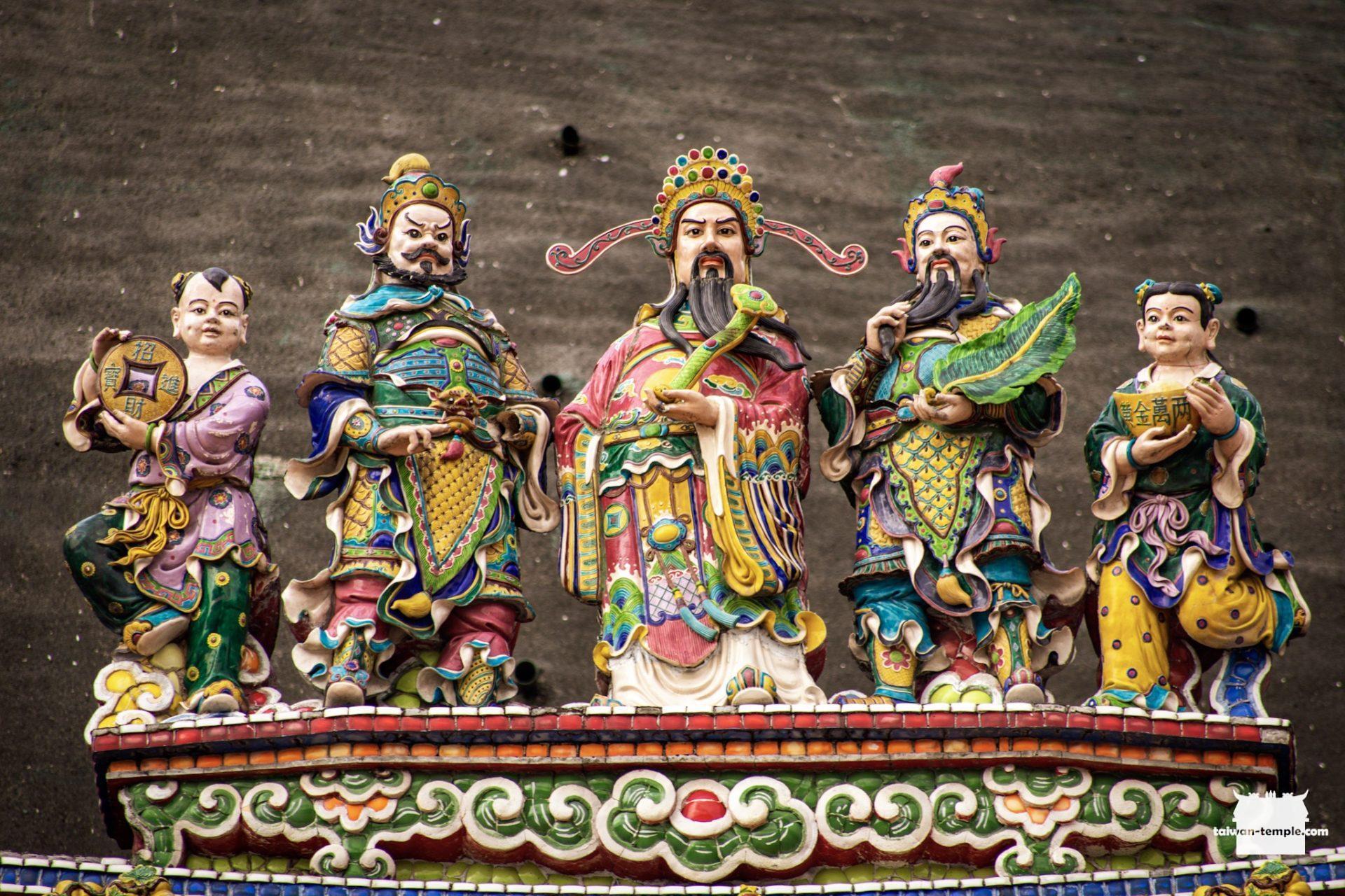 屋根の一番上の中央には、多くの道観では福禄寿を配置していますが、財神殿だからか、珍しくここでは五路財神が祀られていました。